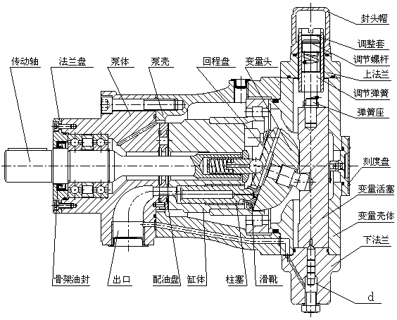來自主體部分的高壓油,進(jìn)入下法蘭下腔(d),當(dāng)彈簧力大于作用在推桿下端面積上的液壓力時,推動變量活塞向下移動,使泵的流量增加。當(dāng)作用在推桿下端面積上的液壓力大于彈簧的作用力時,變量活塞向上移動,使泵的流量減少。