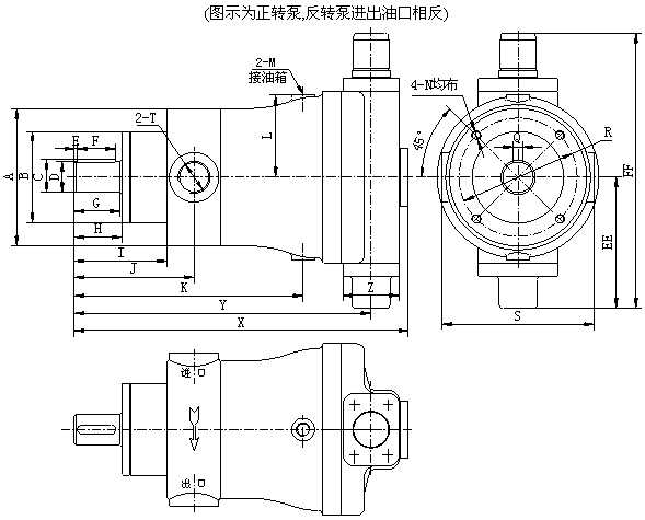 主體部分(參見結(jié)構(gòu)剖)由傳動軸帶動缸體旋轉(zhuǎn),使均勻分布在缸體上的七個柱塞繞傳動軸中心線轉(zhuǎn)動,通過中心彈簧將柱滑組件中的滑靴壓在變量頭(或斜盤)上。這樣,柱塞隨著缸體的旋轉(zhuǎn)而作往復(fù)運(yùn)動,完成吸油和壓油動作。