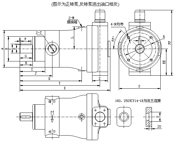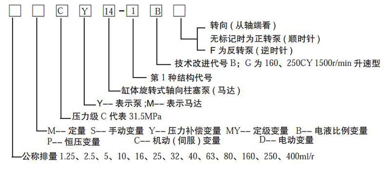 CY14 型軸向柱塞泵是采用配油盤配油、缸體旋轉的軸向柱塞泵。由于滑靴和變量頭之間、配油盤和缸體之間采用了液壓靜力平衡結構,因而與其它類型的泵相比,具有結構簡單、體積小、效率高、壽命長、重量輕、自吸能力強等優點。