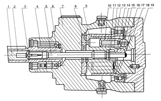 馬達外軸(3)同軸承(4)(6)支承在殼體(7)上,內軸(5)通過花鍵一端與外軸聯接,另一端與缸體(9)花鍵聯接,啟動及空載時缸體在彈簧(2)和(11)作用下與配油盤(8)保持一定的油膜接觸,缸體另一端用軸承(13)支承在殼體上,缸體孔中有7個柱塞(10),柱塞的球形端部與滑靴(17)球窩包鎖,通常在工作時滑靴受油液壓力作用與斜盤(18)保持一定的油膜接觸,但當自吸啟動和轉速突然升高時,滑靴可能浮起,為了防止這種現象,在內軸端部受彈簧(11)作用的球鉸(15)頂住回程盤將滑靴壓在斜盤表面。